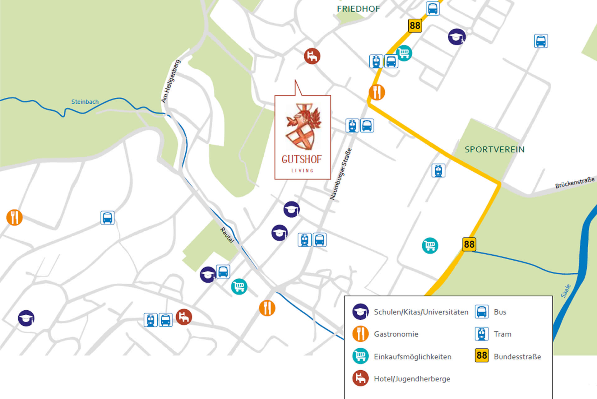 • Straßenbahn-/Buslinien: ca. 500 m