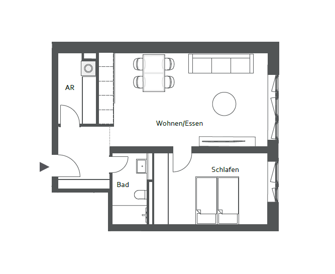 Diese 2-Zimmer-Wohneinheit im Obergeschoss überzeugt mit einem klaren Schnitt und einem wunderbar offenen Wohngefühl. Der Wohn- und Essbereich bietet viel Raum für Entfaltung – ob beim Kochen, Entspannen oder Gäste empfangen. Großzügige Fenster sorgen für helle Räume mit Weitblick und schaffen eine freundliche Atmosphäre. Die wohnliche Kompaktheit dieser Einheit macht sie besonders attraktiv für Singles oder Paare. Trotz der reduzierten Größe fühlt sich hier nichts beengt an – im Gegenteil: Es wirkt leicht, funktional und modern.